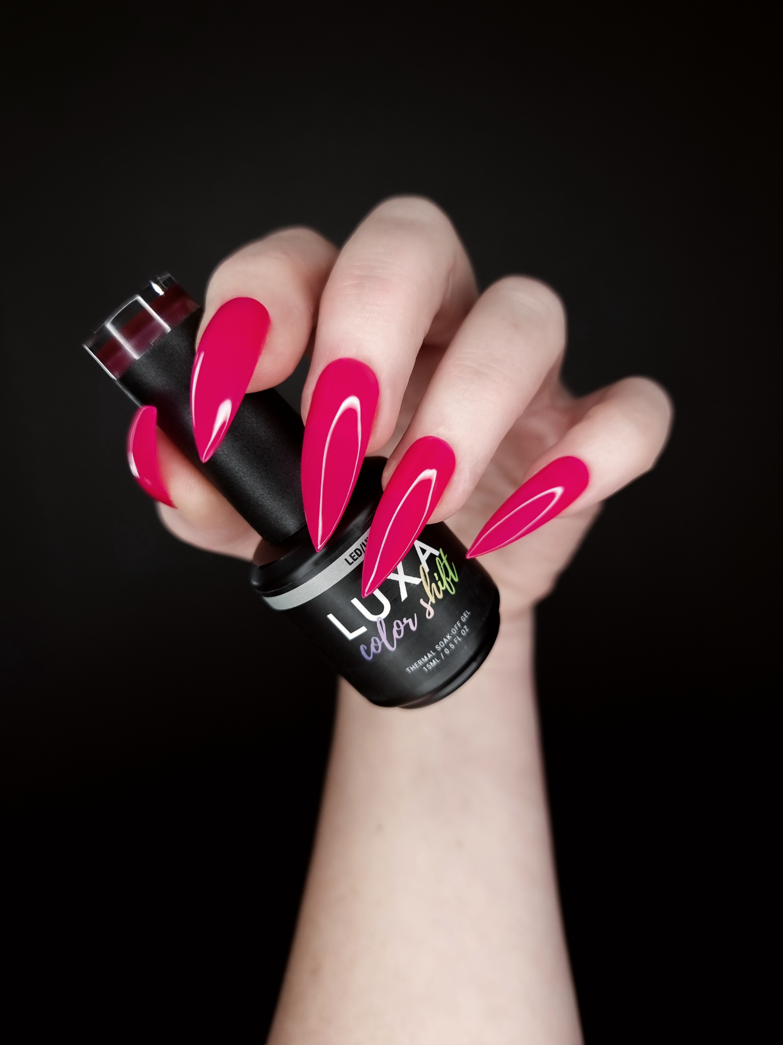 LUXA Color Shift is a gel polish that changes color based on hot or cold temperatures. Love Potion shifts from a dark pink when cold to a bright pink when hot.